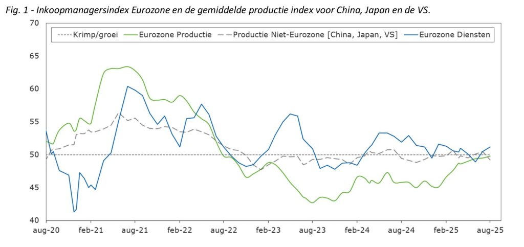• In de dagen hieraan voorafgaand bleek dat voor het eerst in bijna tweeëneenhalf jaar de Europese industrie index met 49,8 punten boven de indexen van zowel China (49,4) als Japan (48,8) en de VS (49,5) was uitgekomen. Een index lager dan 50 punten duidt op teruglopende economische activiteit. In de EU neemt de krimp sinds begin dit jaar af en nu dicht bij het evenwichtsniveau. De index voor de dienstensector is in Europa weer boven de 50 uitgekomen grotendeels gedreven door het vakantieseizoen. In Nederland beweegt de economische groei met 0,1 procent in het tweede kwartaal naar nul.