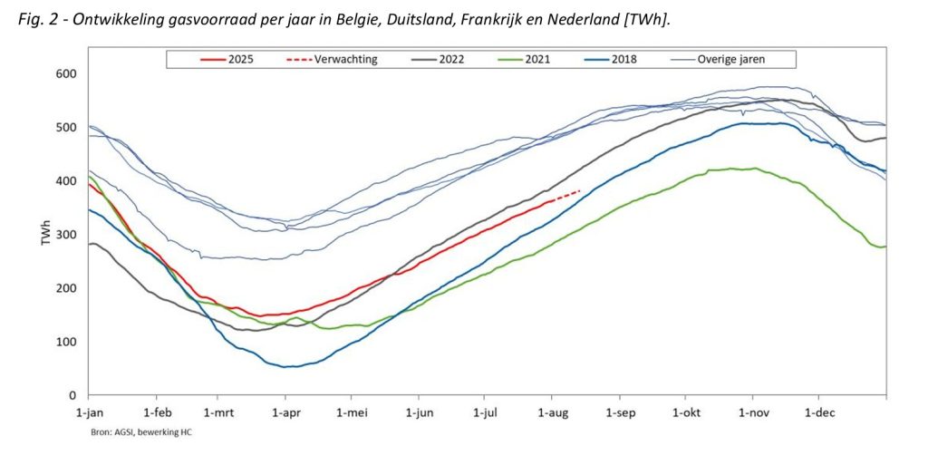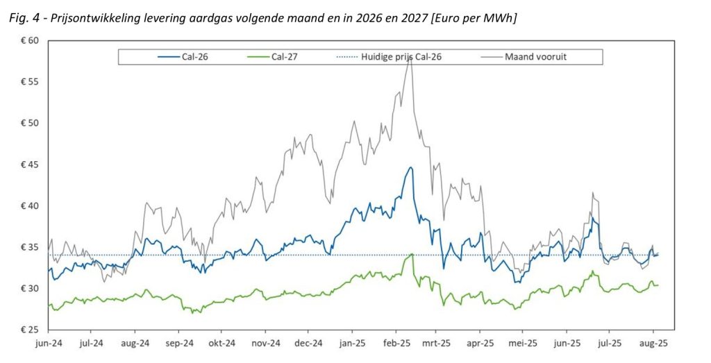 De prijzen bewegen relatief stabiel. De ontwikkelingen in het Midden-Oosten en rondom de importtarieven weten minder hun stempel te drukken op de prijsontwikkeling vergeleken met voorgaande maanden. Met name het weer deze laatste zomermaand op het noordelijk halfrond en de aflopende deadline van Trump aan Poetin in combinatie met de opgave om de Europese gasvoorraden aan te vullen lijkt op dit moment de prijzen in beweging te kunnen zetten. Derhalve lijken de opwaartse risico’s weer wat groter te worden in vergelijking met afgelopen weken.