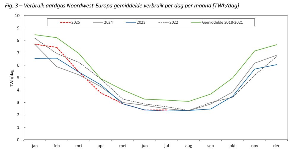 • In de Nederland omringende landen en tevens grote energiemarkten als Duitsland, Frankrijk en het VK is sprake van tamelijke gematigd en niet ongunstig weer met het oog op energieprijzen. Wel laten de weermodellen deze maand weer warmer weer zien met kans op een hittegolf in Frankrijk. In delen van de VS en China valt na een periode van zeer hoge temperaturen veel regen. Veel LNG-schepen zetten afgelopen weken koers naar Azië vanwege de koelingsvraag.