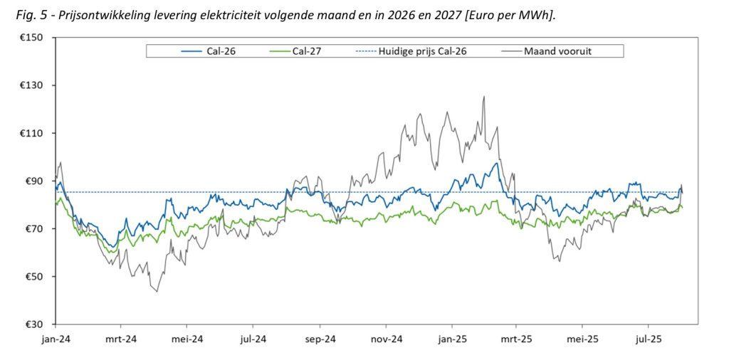 De Cal-26 elektriciteitsprijs was vorige week met ongeveer 4 procent gestegen. De stijging was in procenten daarmee wat kleiner dan bij aardgas. De TTF Cal-26 aardgasprijs steeg met ongeveer 5 procent. De ‘maand-vooruit’ prijs steeg bij de maandwissel wel. De prijs voor september noteert ca. 10 procent hoger dan de prijs voor augustus op de laatste handels dag voor deze maand. Tijdens de zomermaanden liggen de korte termijnprijzen elektriciteit anders dan bij aardgas ruim onder de termijnprijzen door het aandeel zon in de energiemix.